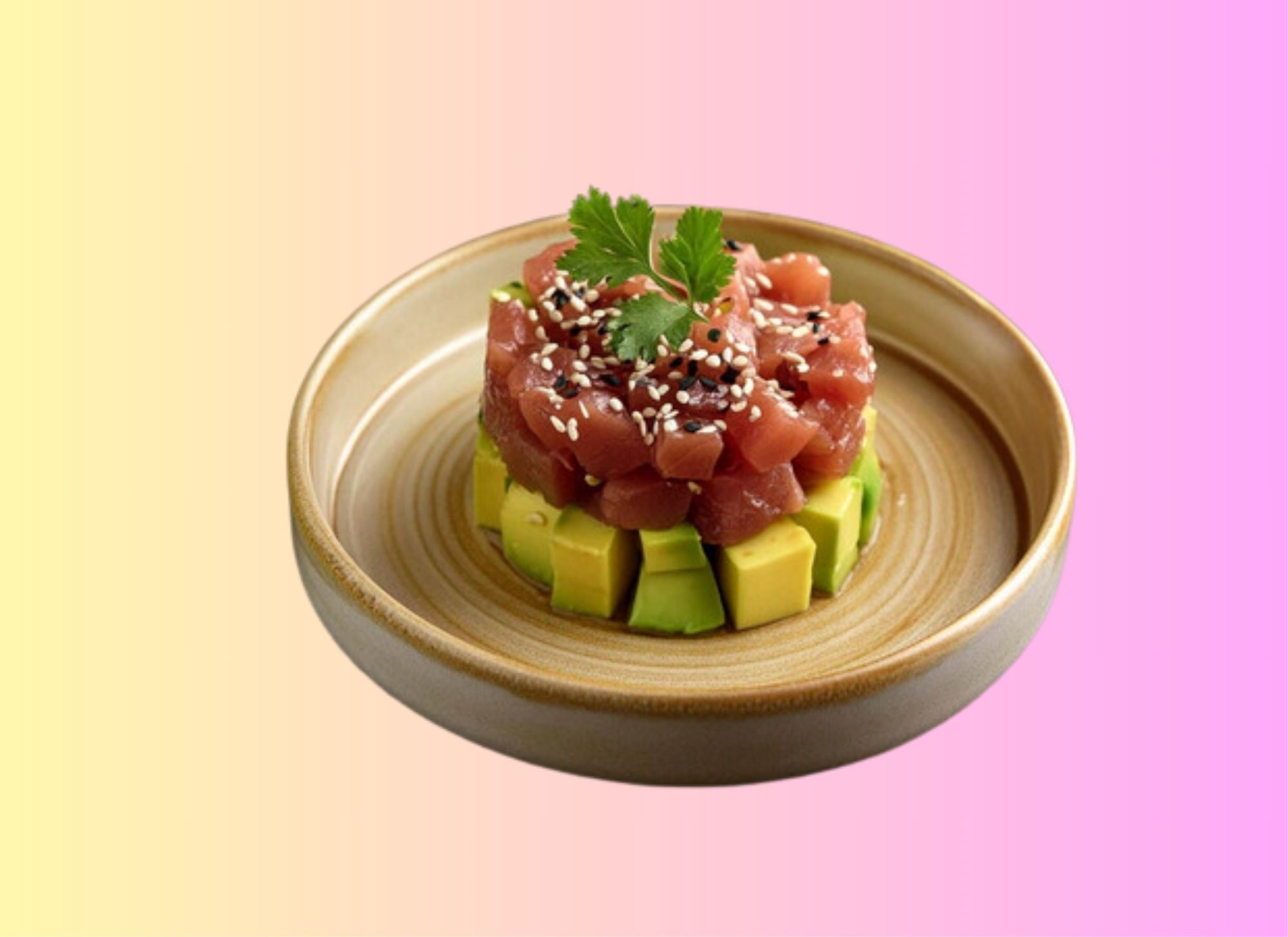 Thon, saumon, tartare de thon et saumon, shiso, concombre, avocat